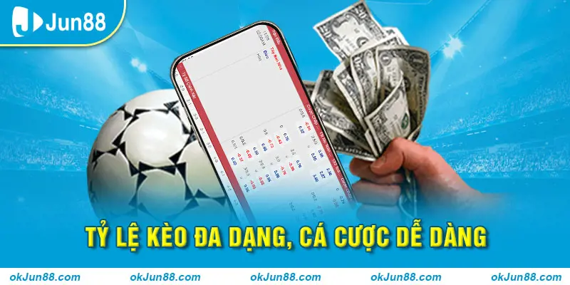 Không chỉ được theo dõi trực tiếp bóng đá tại Jun88, bạn còn có thể tham gia cá cược trực tuyến với những tỷ lệ kèo đa dạng, Các kèo cược tại nhà cái vô cùng phong phú, trong đó phải kể đến kèo châu Âu, kèo châu Á hay kèo tài xỉu,...Đây đều là các loại kèo phổ biến, được nhiều người lựa chọn hiện nay.